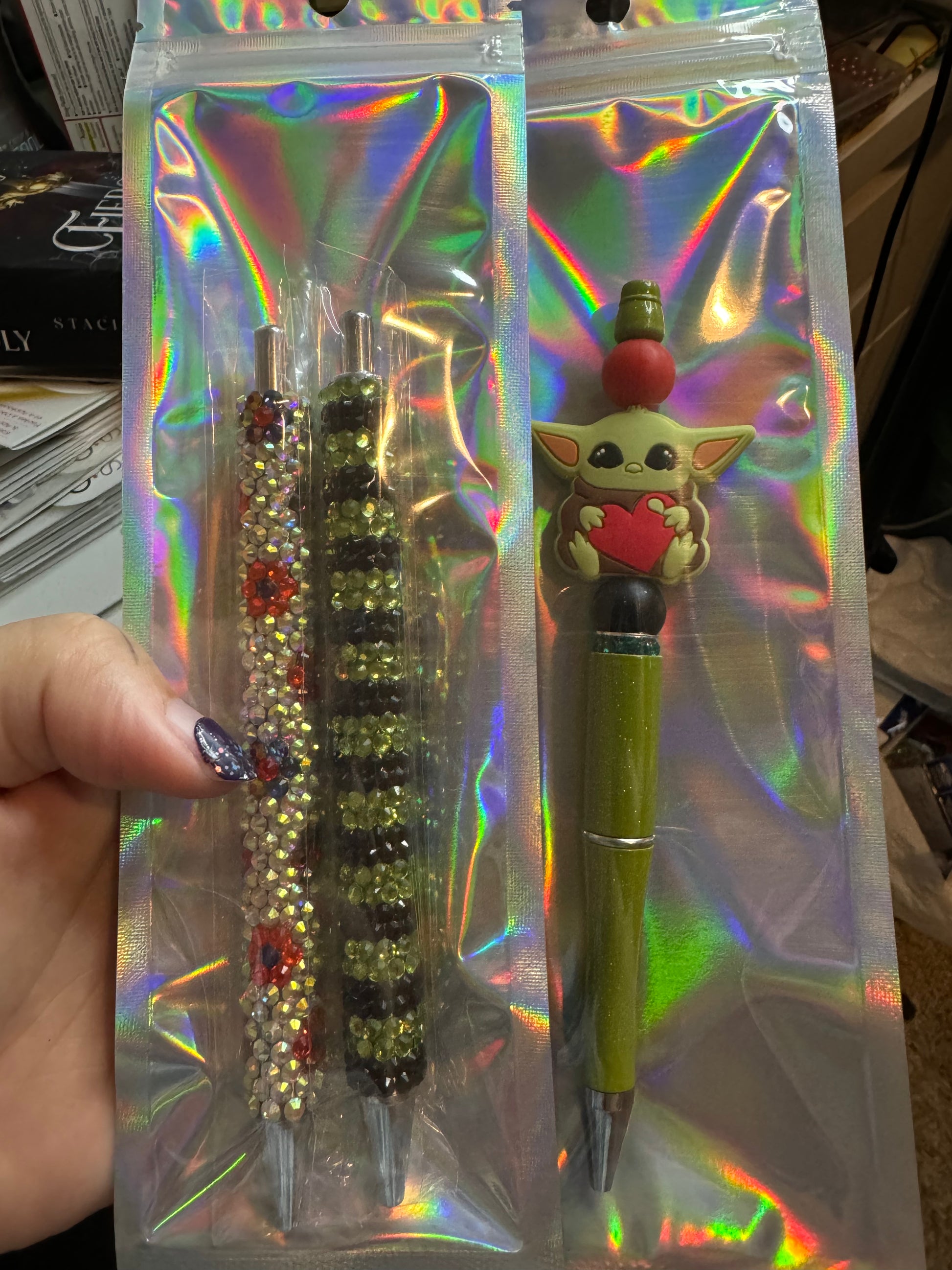 2 rhinestone pens and a baby green guy.